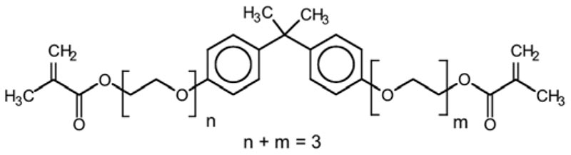 This form of EBPADMA has 2 to 4 units of ethoxylation and is sometimes referred to bis-EMA or Isopropylidenediphenol PEG-2 Dimethacrylate. It is often used in blends with triethyleneglycol dimethacrylate and bisGMA. This material has low levels of water sorption and a high polymerization rate. Sometimes referred to as Isopropylidenediphenol PEG-2 Dimethacrylate, this product has also been used in anaerobic adhesive applications